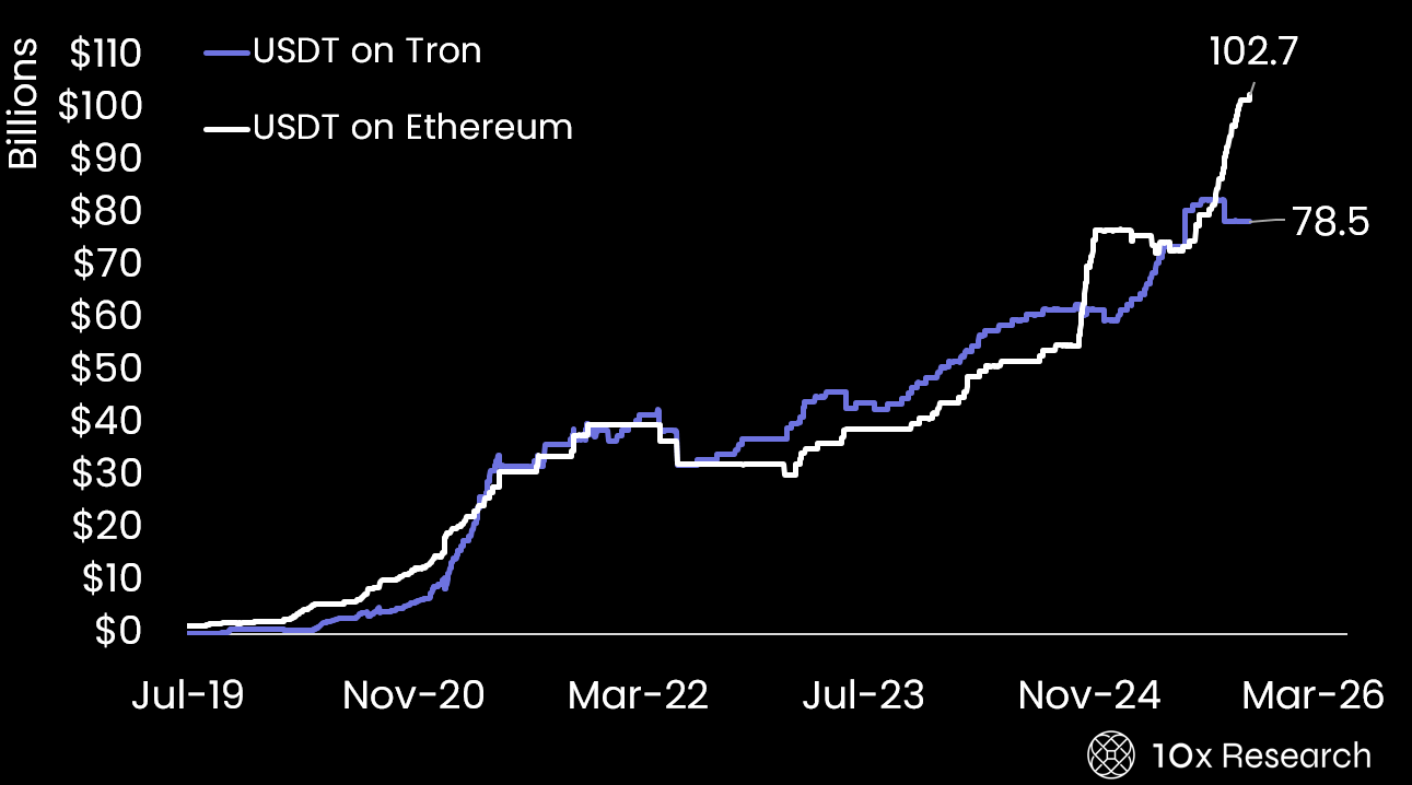 Stablecoin issuance from Tether on Tron and Ethereum ($ billions)